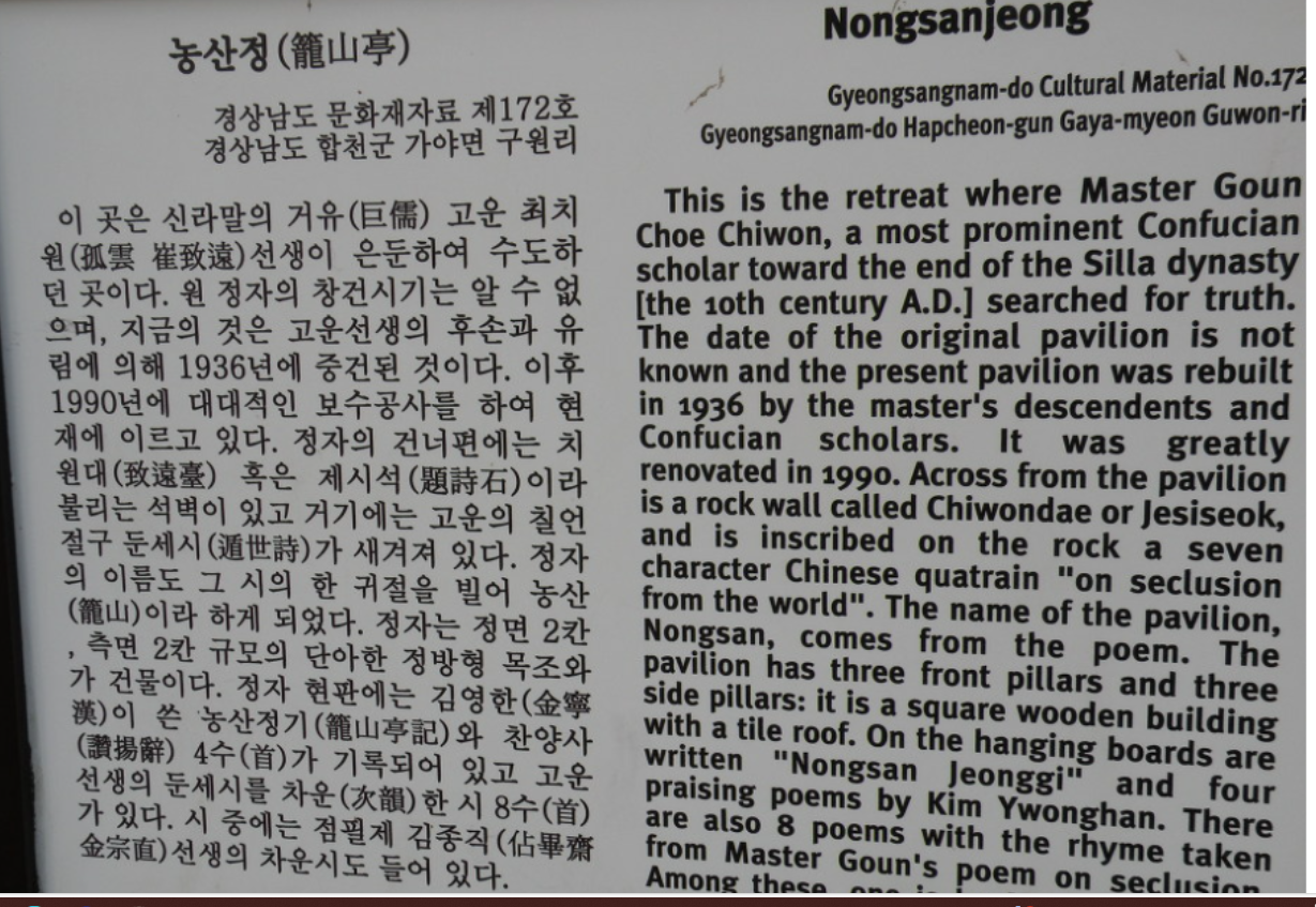 일찍이 일어나 오늘도 조상님전을 방문 중시조 최치원선생님전 상황 농산정 이란 석벽제시 글 따서 농산정이라 하였다고 전하고 있고 그 건물이 흔적만 남아있었던 정자인데 나 최평열의 증조부이신 최종기와 조부이신 최정순 부자가 지방 유림(농산정유계)이 협조하여 복원한 것으로 기록이 남아있고 그 증거는 같은 면애 산 권병석 문화원장이 사실 그대로 합천문화원 책에 기록하였는데 그 후임들이 허위로 왜곡 한 것이 너무많다, 사진에 찍어올려 본다.