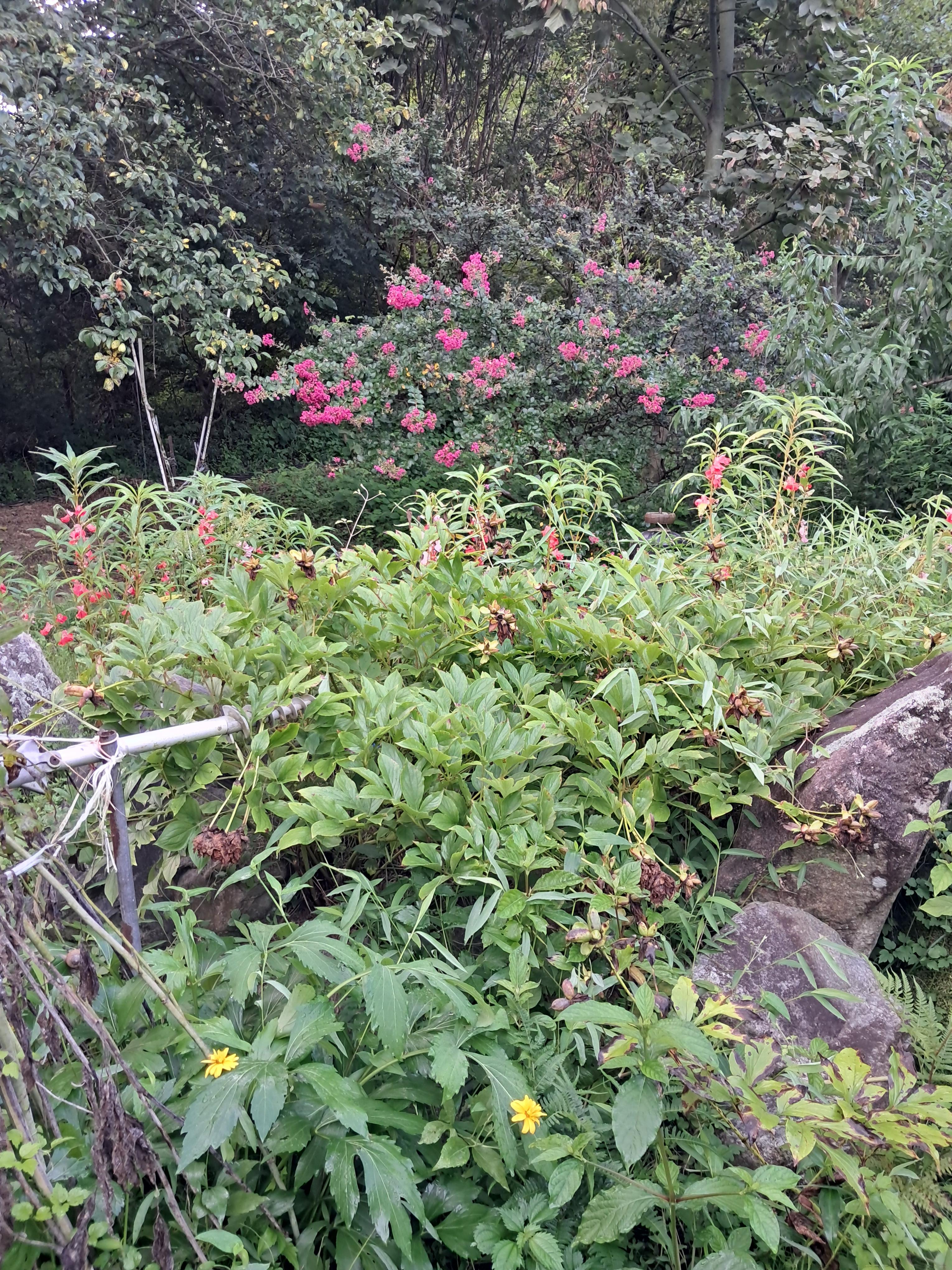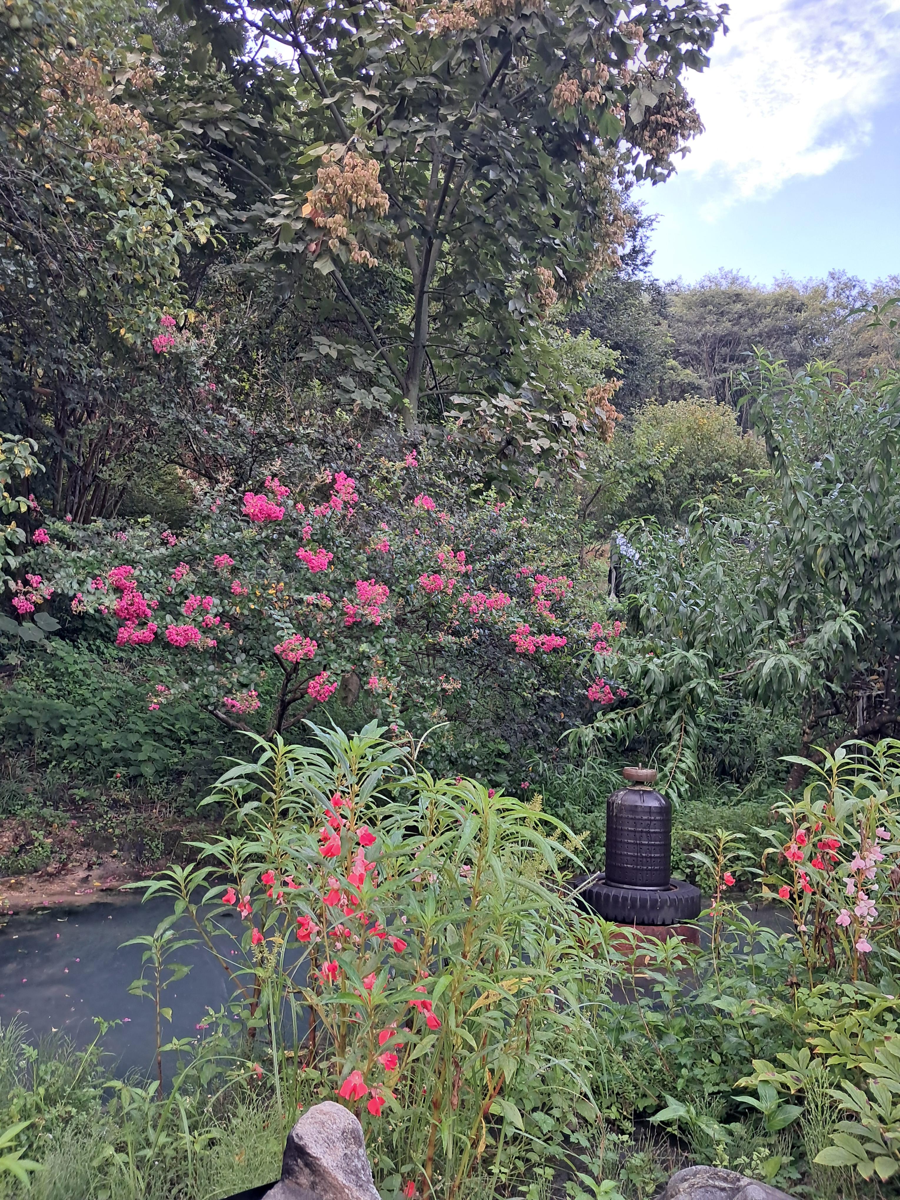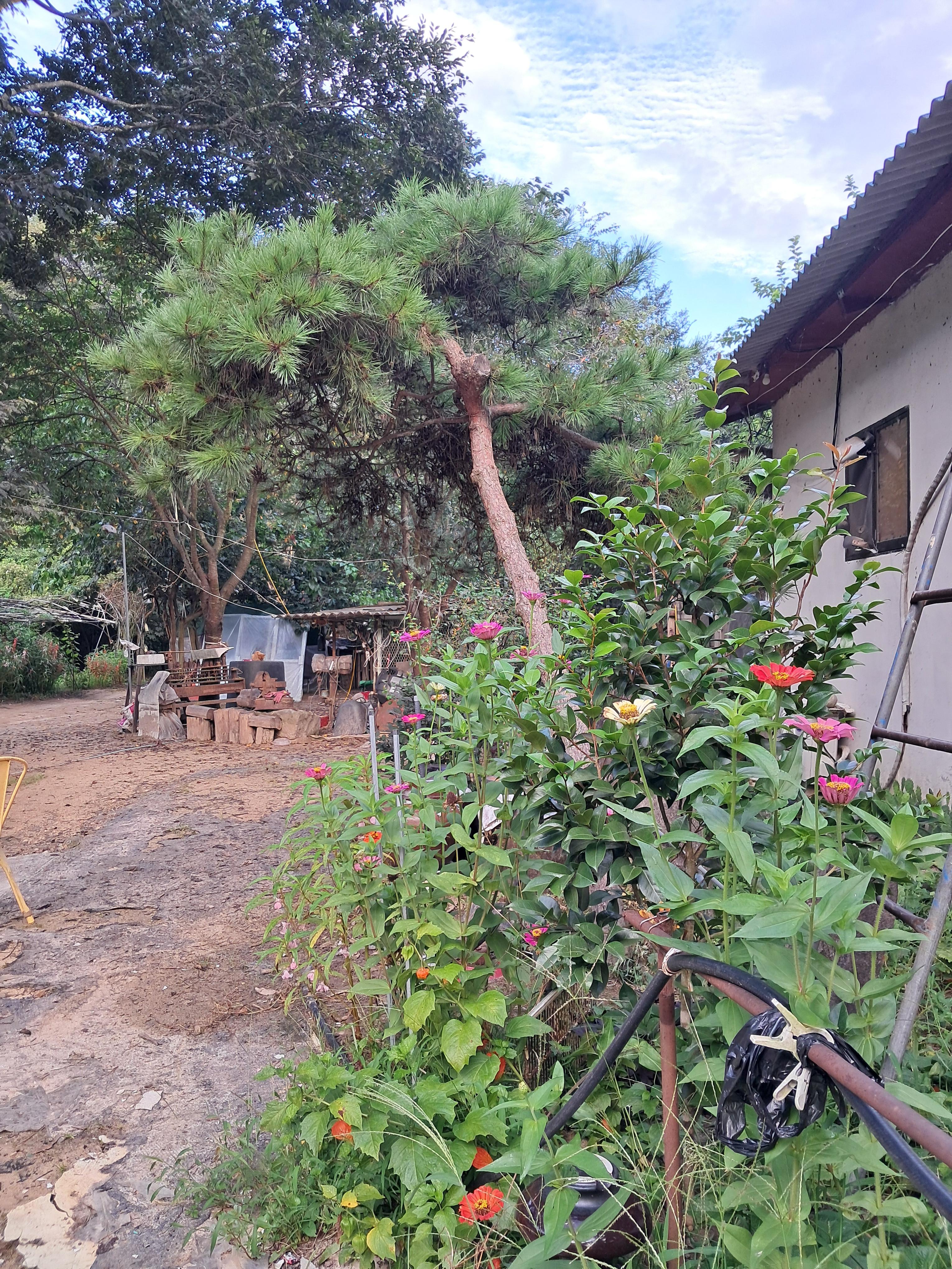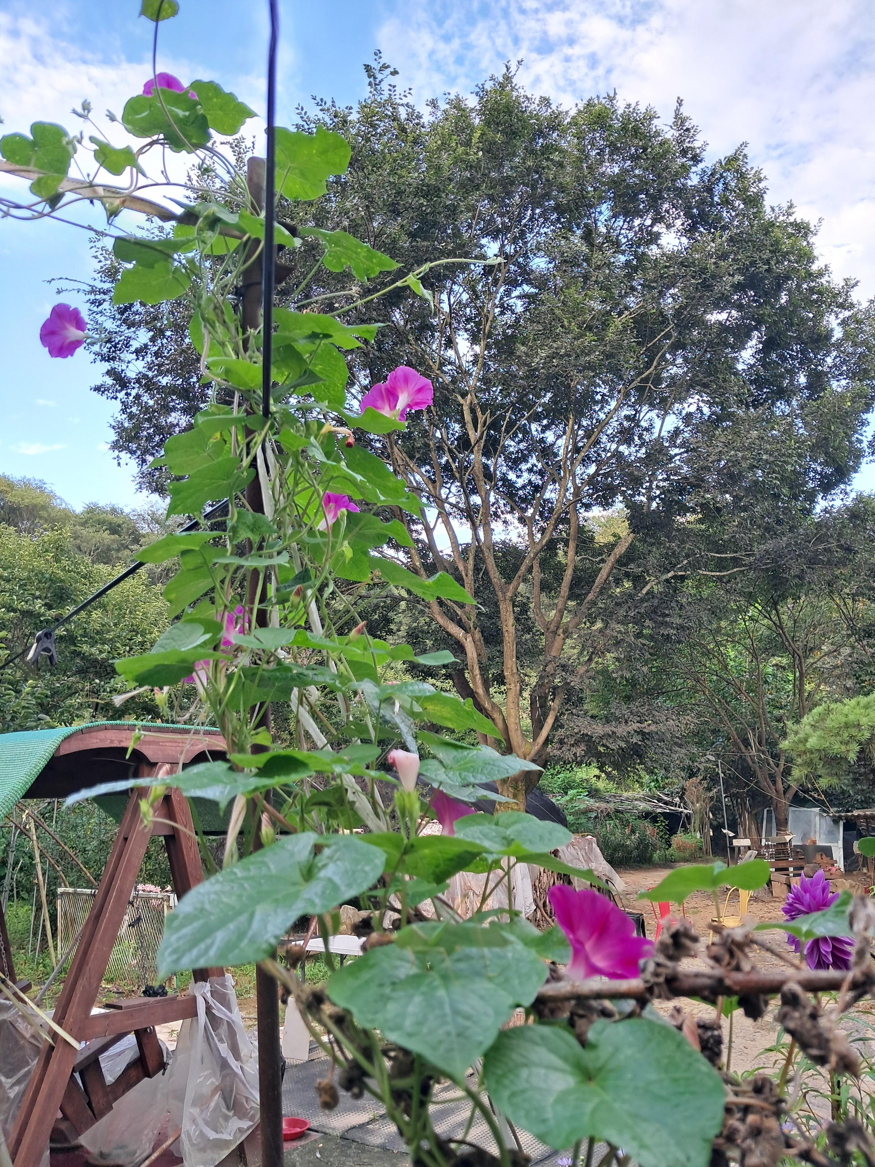 오늘 조상님께 일어나자 향불 피우고 기도하고, 마당에 나가 꽃밭 텃밭 느티나무 팽나무 표고버섯장 경비견 개들 밥주고 나의 가묘에 벌초하고 주변에 넘어진 나무 제거하고 풀죽는 제초제 2통치고 메롱나무꽃 다알리야꽃 나팔꽃 봉숭화꽃 난초꽃 백일홍꽃 홍매화꽃 찍는 등 ~