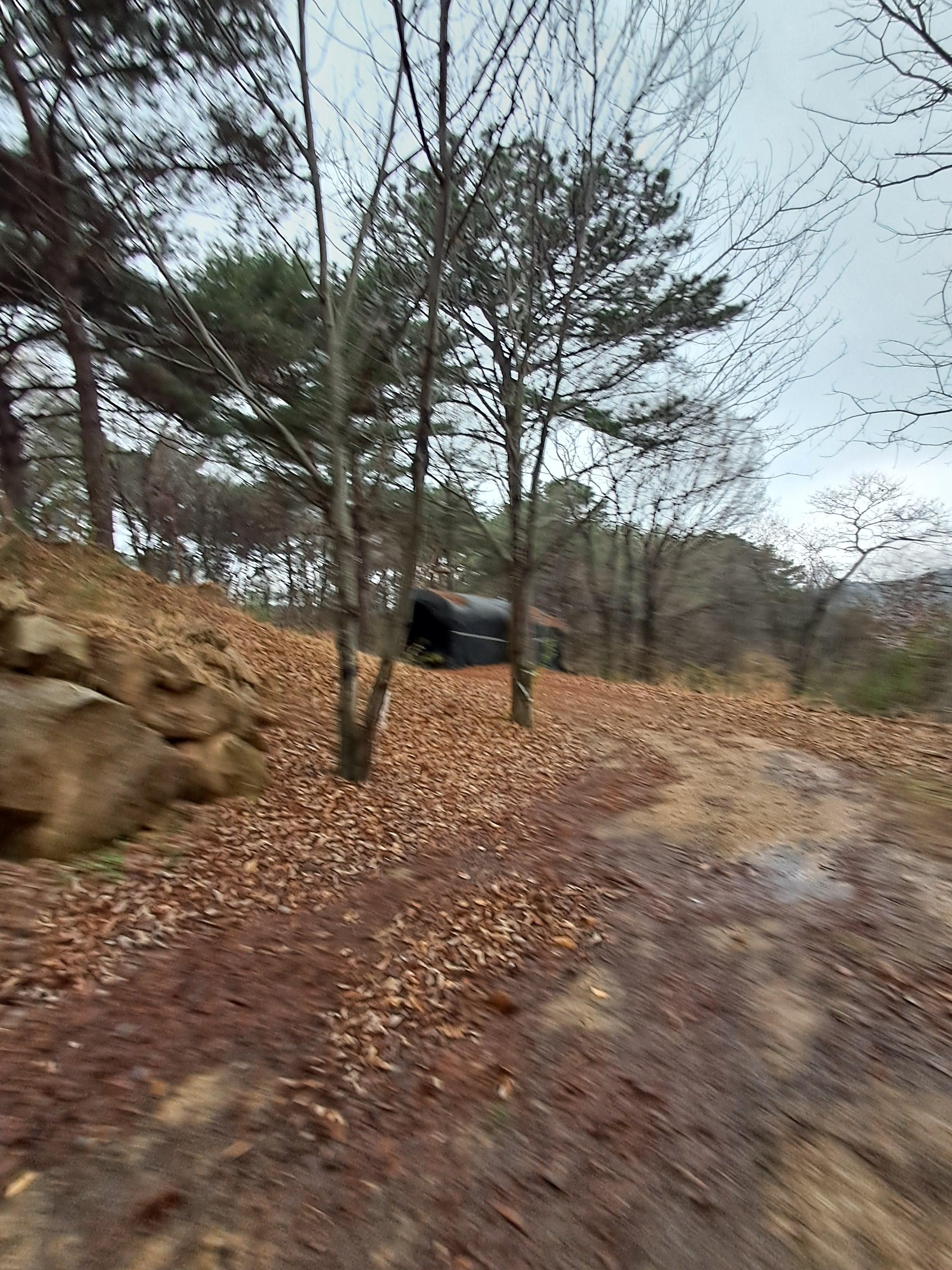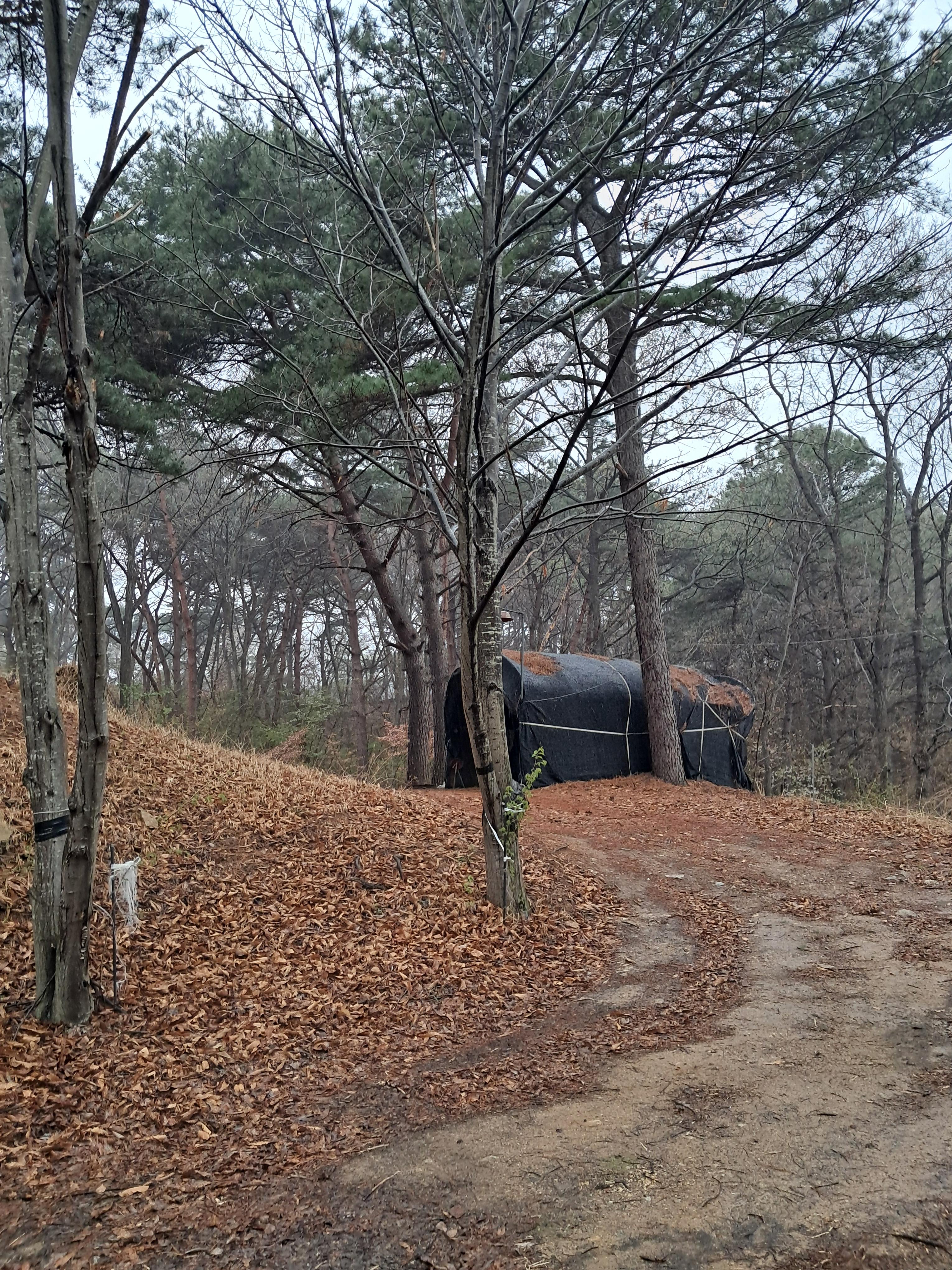 느티남 소나무숲에 경비경 개와 고양이 딹 밥주고.
